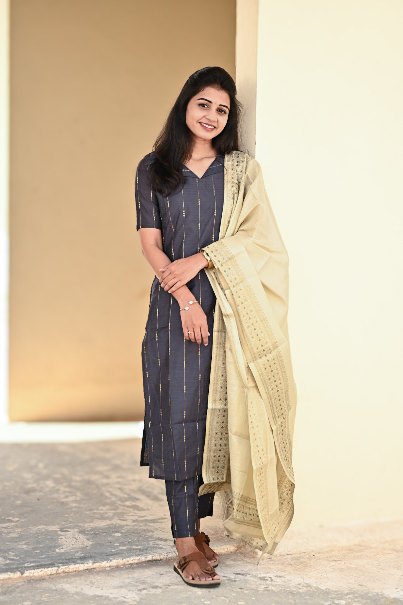 A classic straight-cut kurti styled with pocketed pants and a complementing dupatta.Â